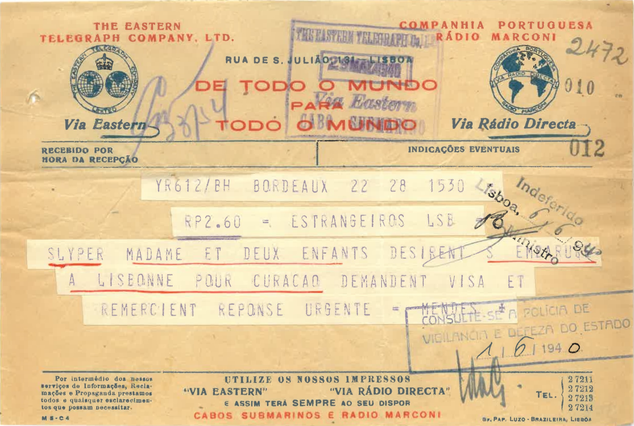 The numbered visas were issued by Aristides de Sousa Mendes in Bordeaux on June 18, 1940. Sousa Mendes requested a visa for Joseph SLYPER in a telegram to Salazar, the Portuguese head of state, but the latter denied it in a return telegram.